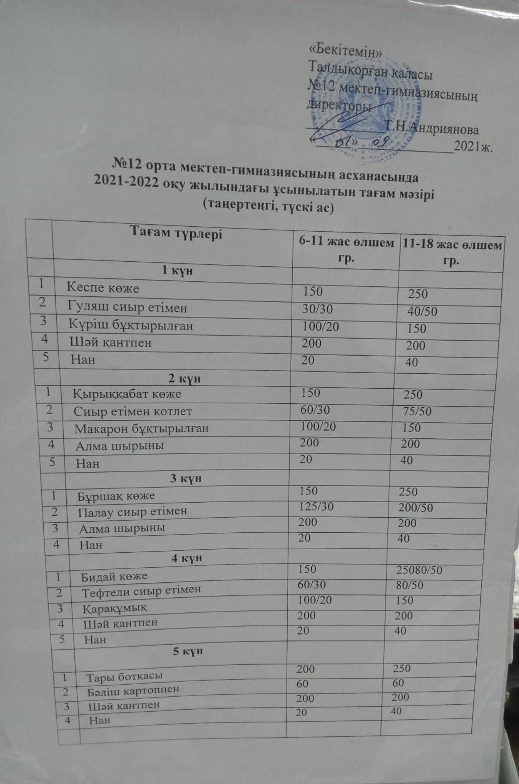 МЕНЮ СТОЛОВОЙ » "№12 орта мектеп-гимназиясы" Талдықорған қаласы