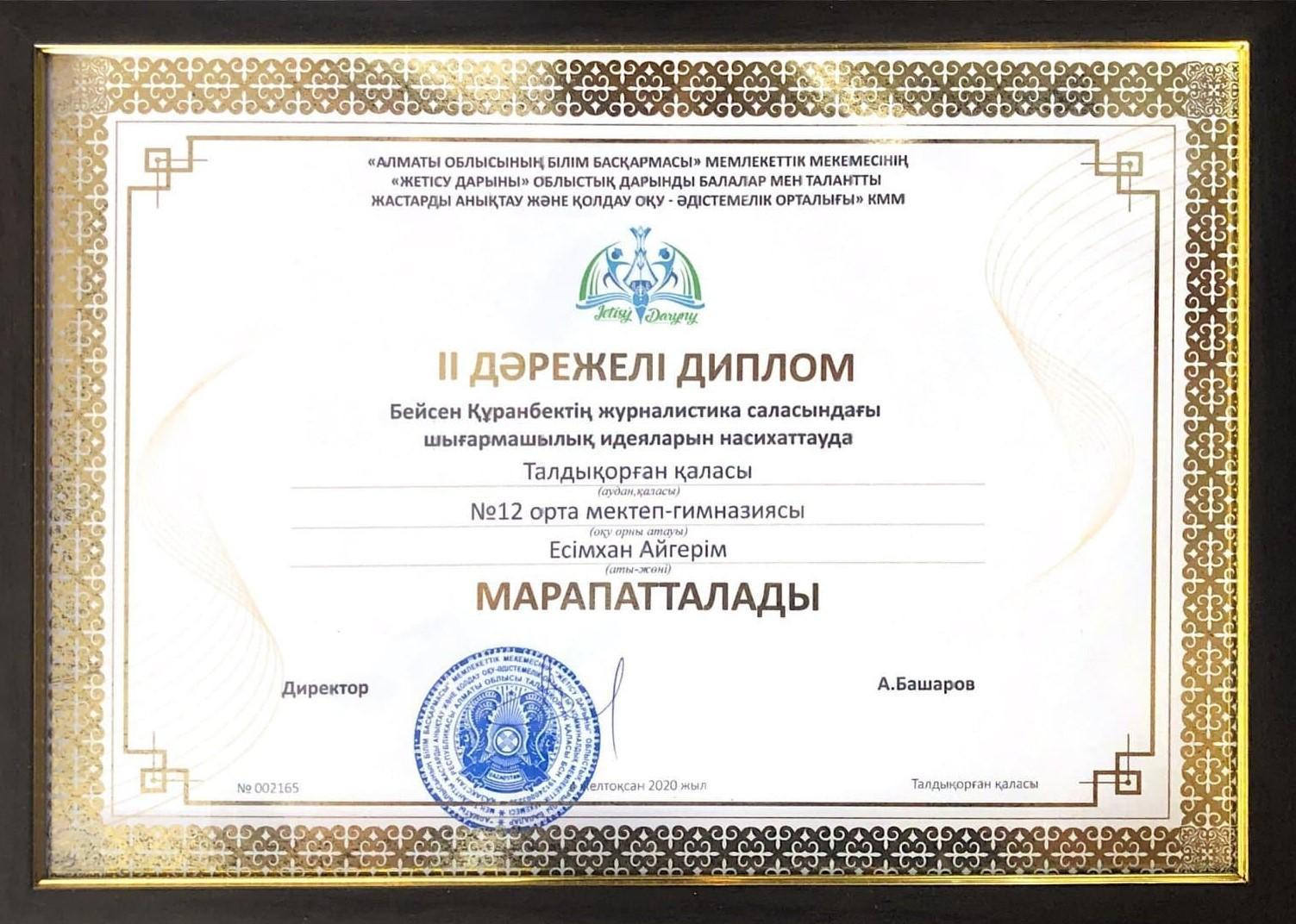 "Алматы облысының білім басқармасы" мемелекеттік мекемесінің "Жетісу Дарыны" облыстық дарынды балалар мен талантты жастарды анықтау және қолдау оқу-әдістемелік орталығы" ҚММ ұйымдастырған Бейсен Құранбектің журналистика саласындағы шығармашылық идеяларын насихаттауда №12 орта мектеп гимназиясының 10 сынып оқушысы Есімхан Айгерім ІІ дәрежелі дипломымен марапатталды.