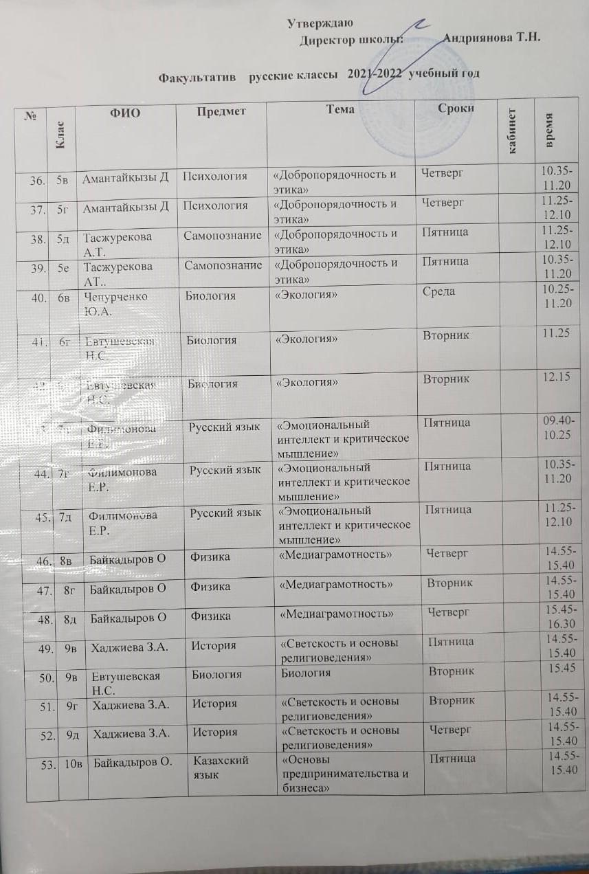 РАСПИСАНИЕ факультативов 2021- 2022 учебный год » "№12 орта мектеп-гимназиясы" Талдықорған қаласы